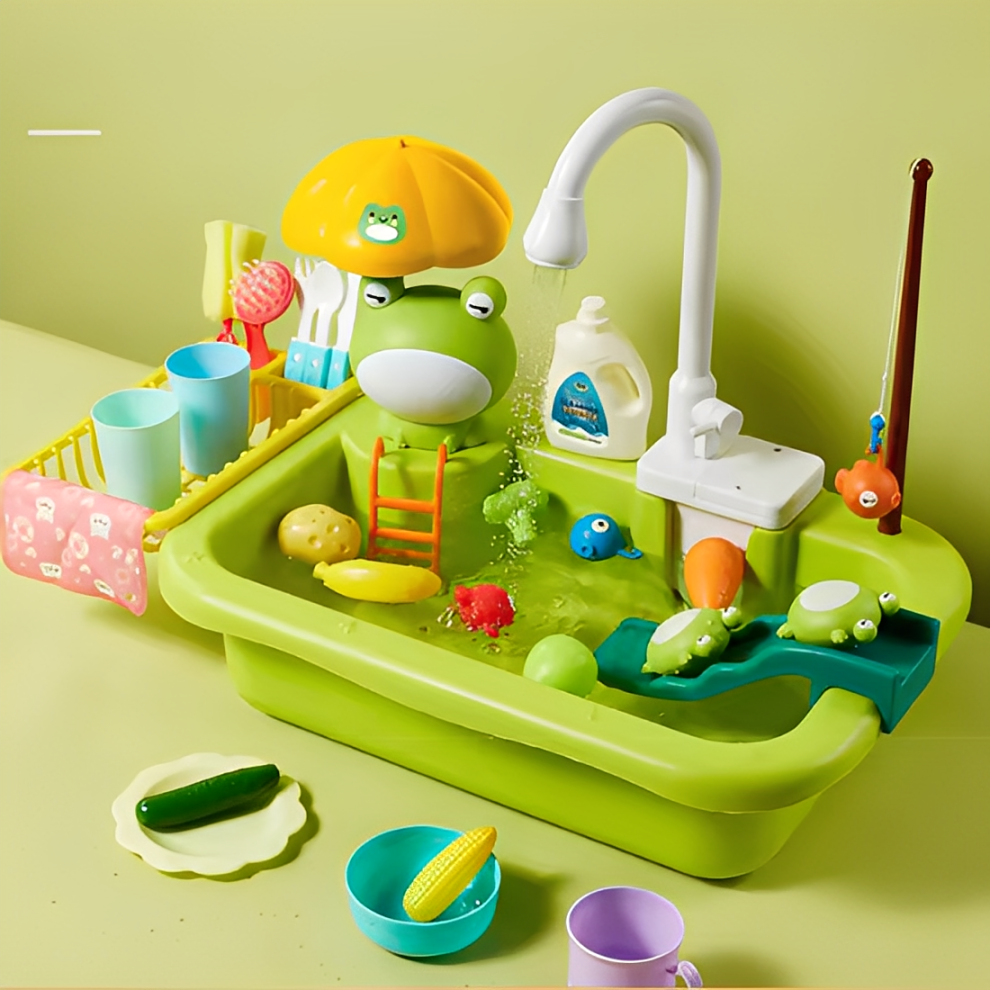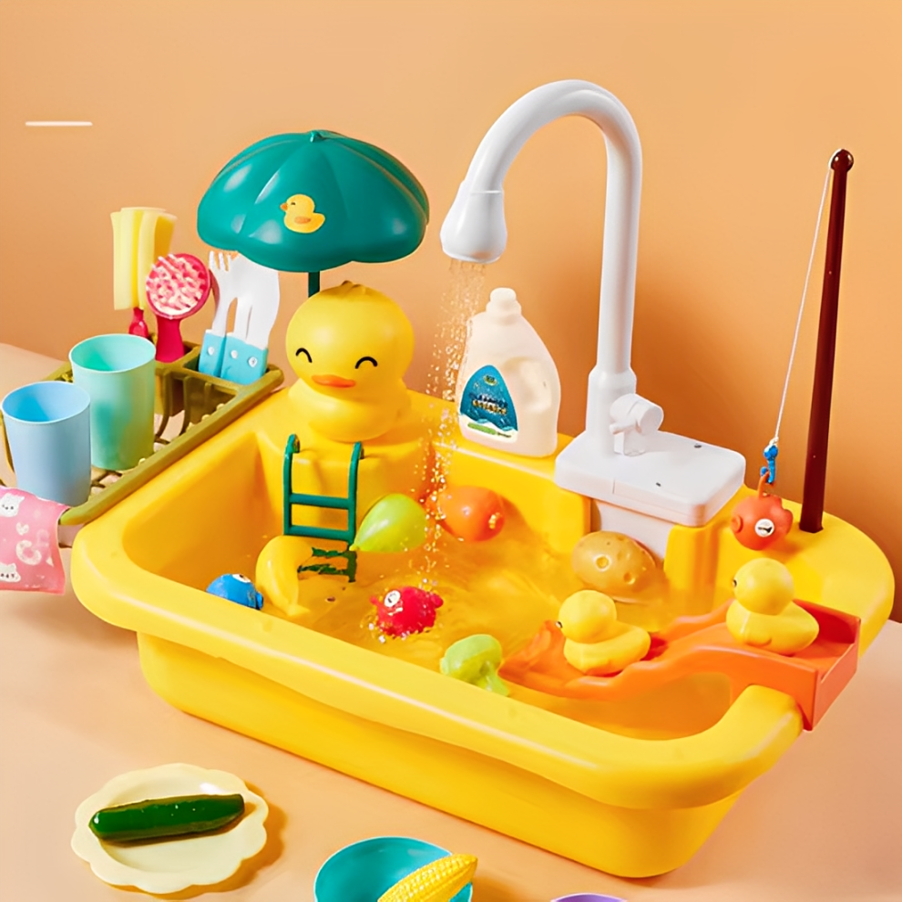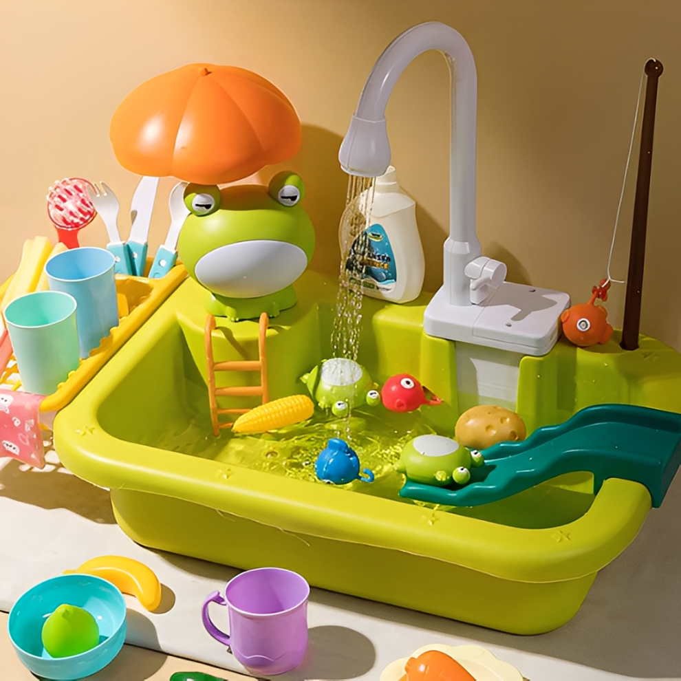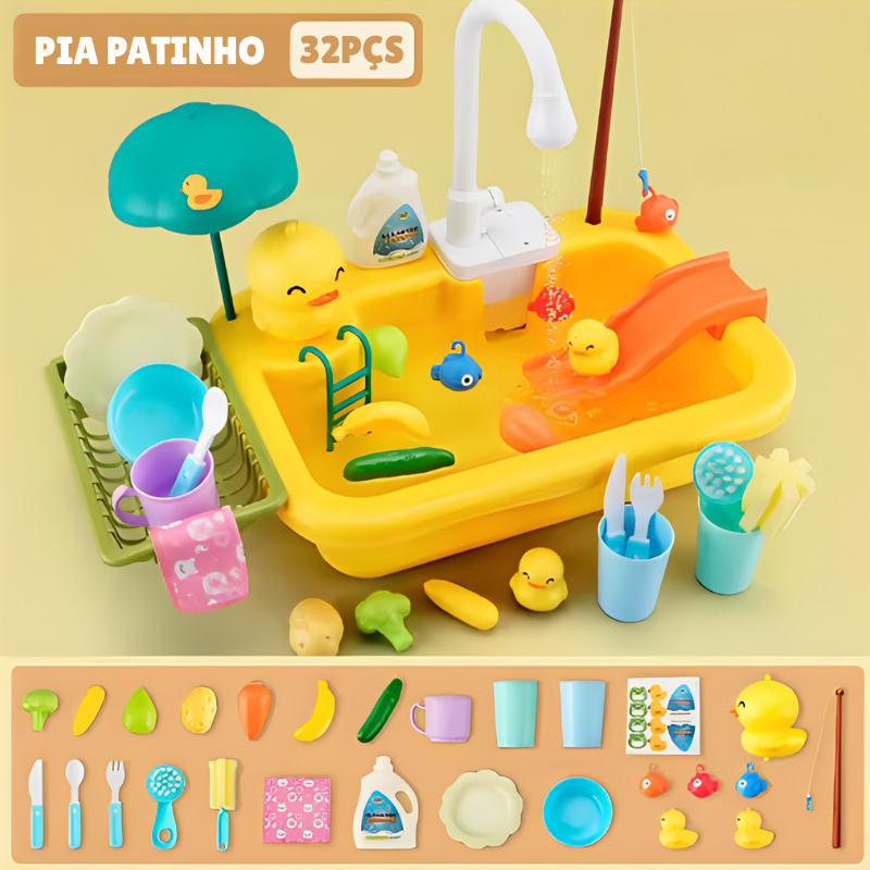 Com formato de pia funcional, torneira com água de verdade, utensílios, comidinhas e até peixinhos para pescar, essa brincadeira transforma o momento em um cenário cheio de possibilidades.